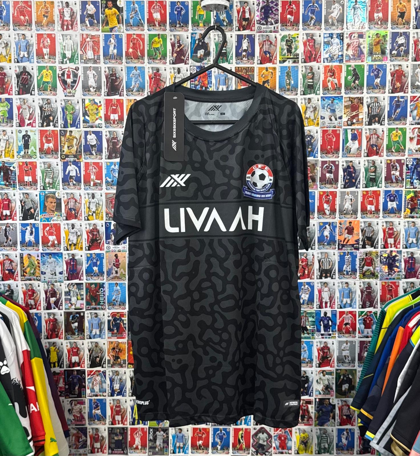 Description - This away shirt features a striking all-black camo-style pattern with sleek tonal detailing, produced by Indian sportswear brand Kreedon. The club badge pops against the dark base, paired with the modern “LIVA AH” sponsor across the chest. Lightweight AEROPLUS fabric keeps it breathable, perfect for on-pitch performance or streetwear flex. A rare shirt from the Indian football scene